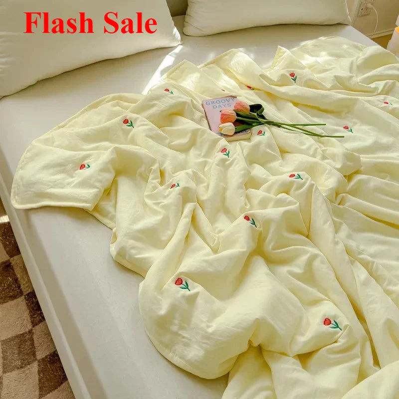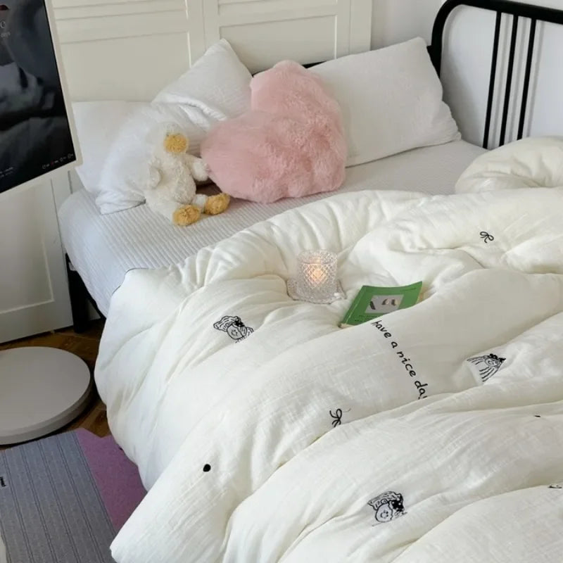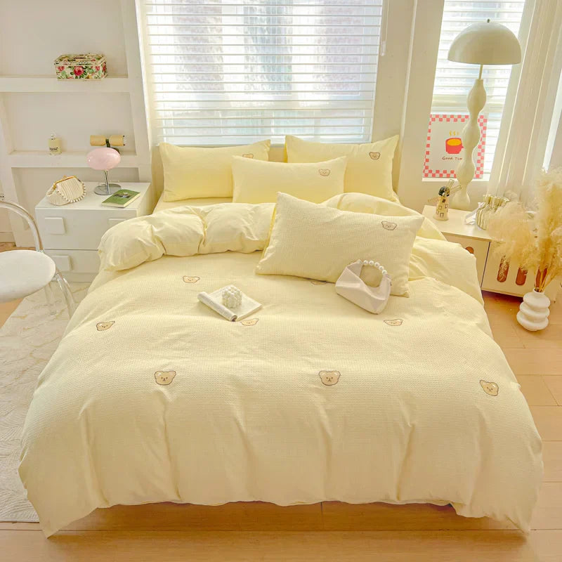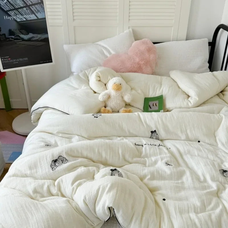 The embroidered design adds a touch of elegance and charm to your bedroom decor. Crafted with care and precision, this bedding set includes a duvet cover, 2 pillowcases, and 1 sheet, all featuring a delightful cartoon style that will brighten up your room.