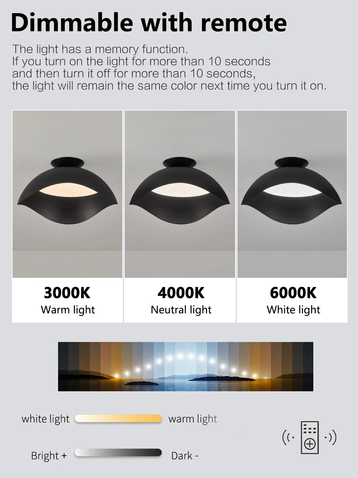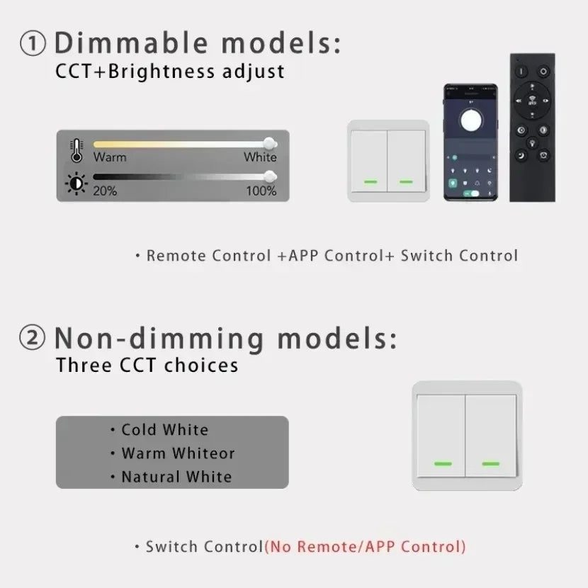 Choose from different CCT options for dimmable and non-dimming models, including warm white, cold white, and natural light, to suit your preference and create the perfect lighting environment. With both APP and remote control functionality, you can easily adjust the brightness and color temperature to achieve the desired ambiance.