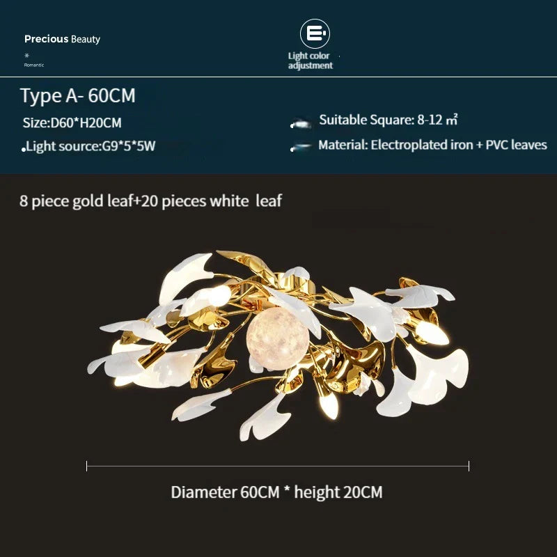 This ceiling chandelier features a unique ginkgo leaf design, adding a touch of nature-inspired beauty to your room. The aluminum and PVC construction, along with ironware and acrylic accents, exudes quality and sophistication. The gilding technics used in the manufacturing process enhance the overall aesthetic appeal.