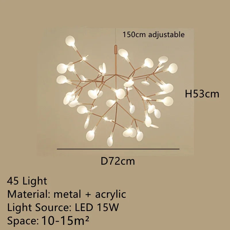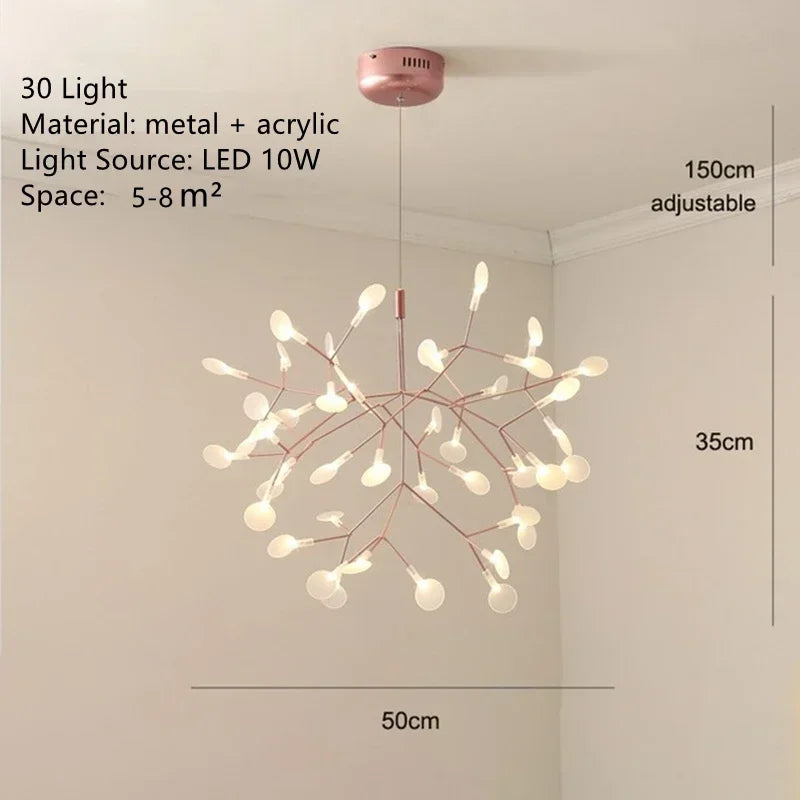 Illuminate your surroundings with style and elegance with the Ljojo Firefly Chandelier. Featuring a multitude of LED bulbs, this chandelier provides ample lighting to cover a spacious area of 15-30 square meters. The beautiful combination of rose gold and black accents adds a touch of modern sophistication to any room.